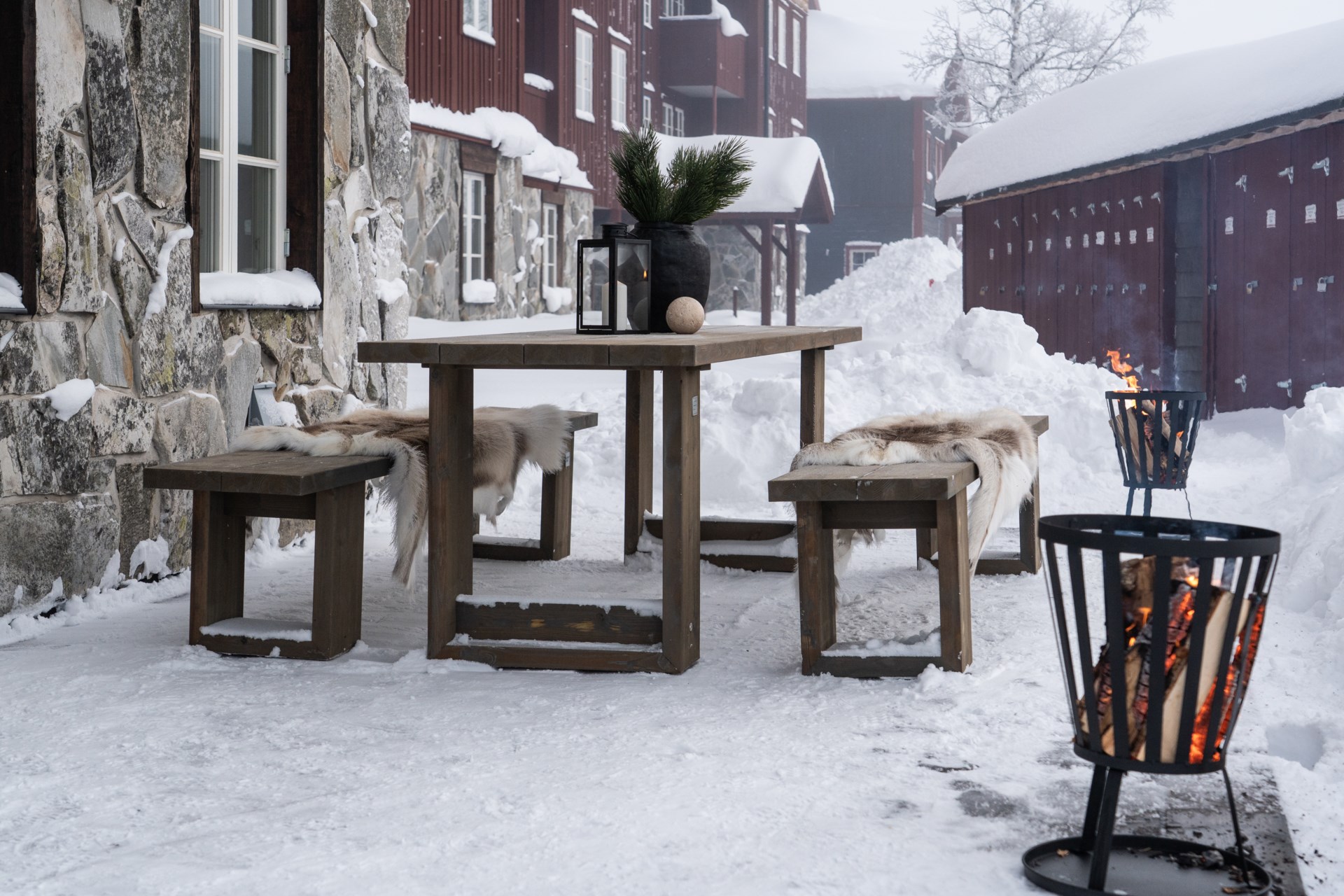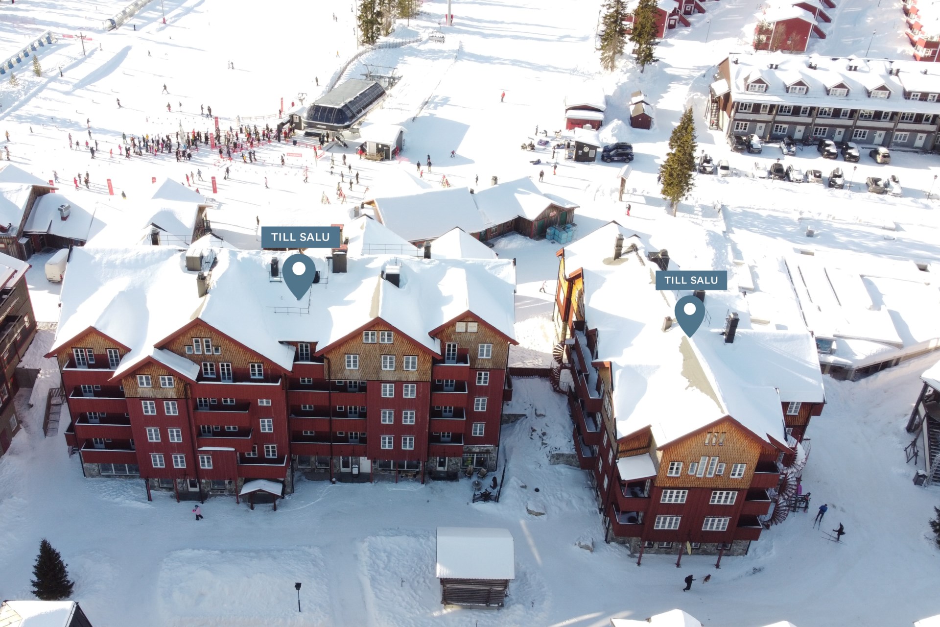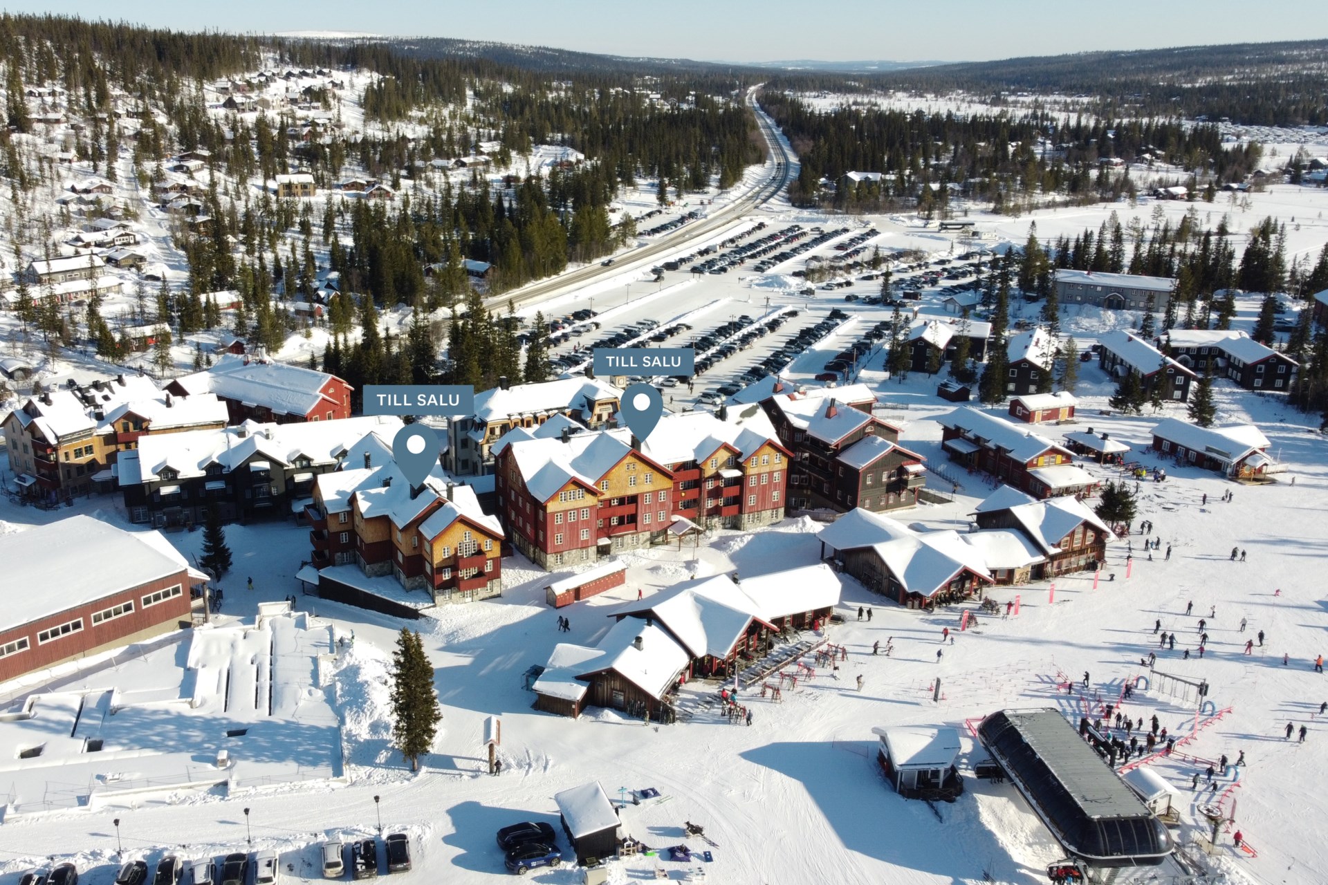 Dedikerade platser utomhus på skidanläggningens stora parkeringsplan.